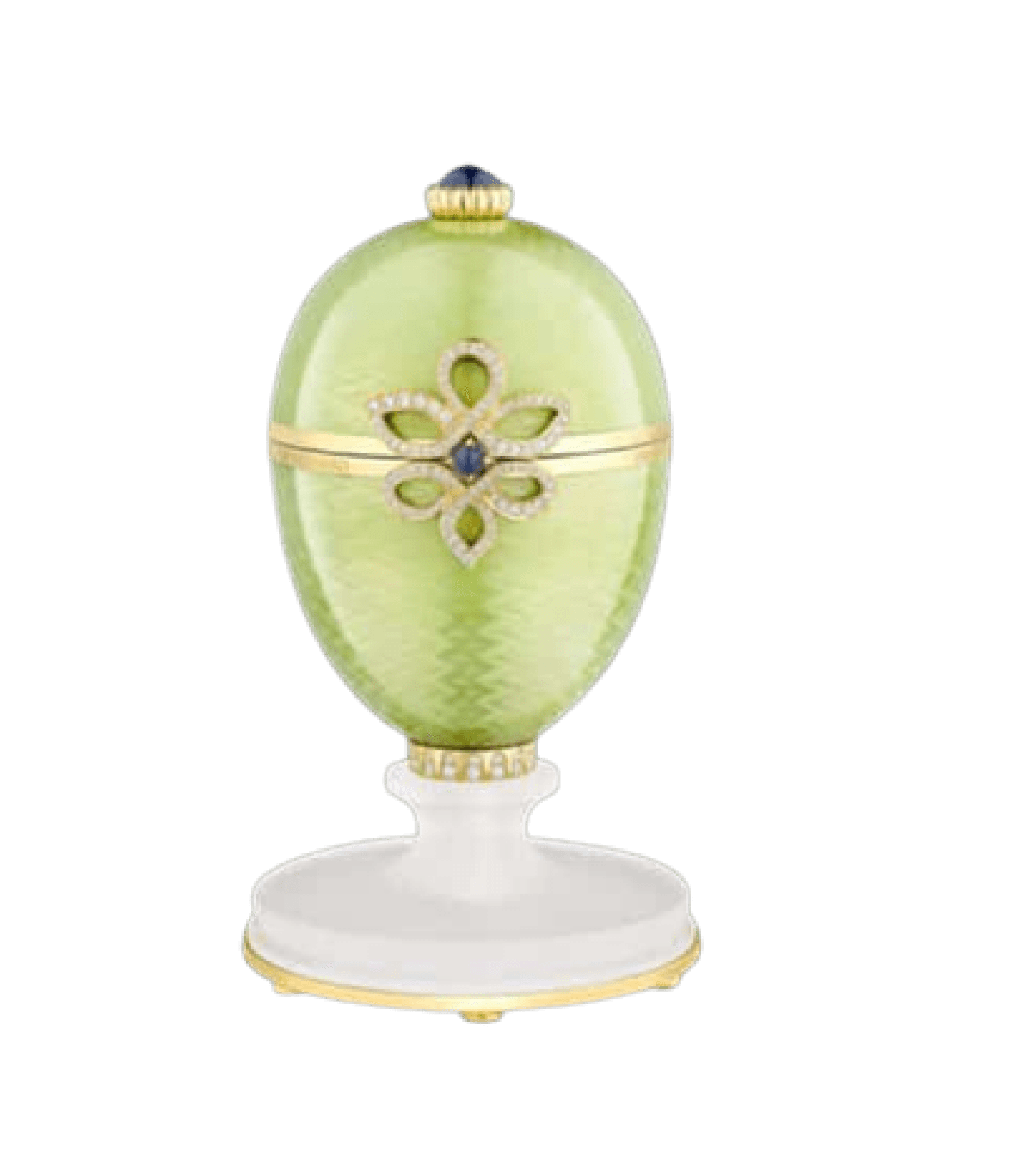Crafted to honour Ireland, the green, white and gold colours of the egg call to mind the Irish flag, while each is adorned with a pavé Celtic knot. Set with 104 brilliant-cut diamonds, the knot is a renowned symbol of Irish heritage and has no start or finish, representing eternity, love and friendship. In true Fabergé spirit, a surprise awaits in the form of a rough, uncut emerald, sourced from Gemfields’ Kagem mine in Zambia.